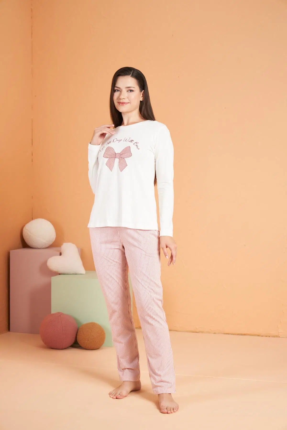Bu pijama takımı sadece rahat bir uyku kıyafeti değil, aynı zamanda evde keyifli anlarınızın da şık yoldaşıdır. Yazılı ve fiyonk baskıları genç ve dinamik bir görünüm sağlarken, çizgili alt tasarım klasik bir zarаfeti yansıtır. Sevimli detaylar ve modern kesim, kendinizi özel hissetmenizi sağlar.