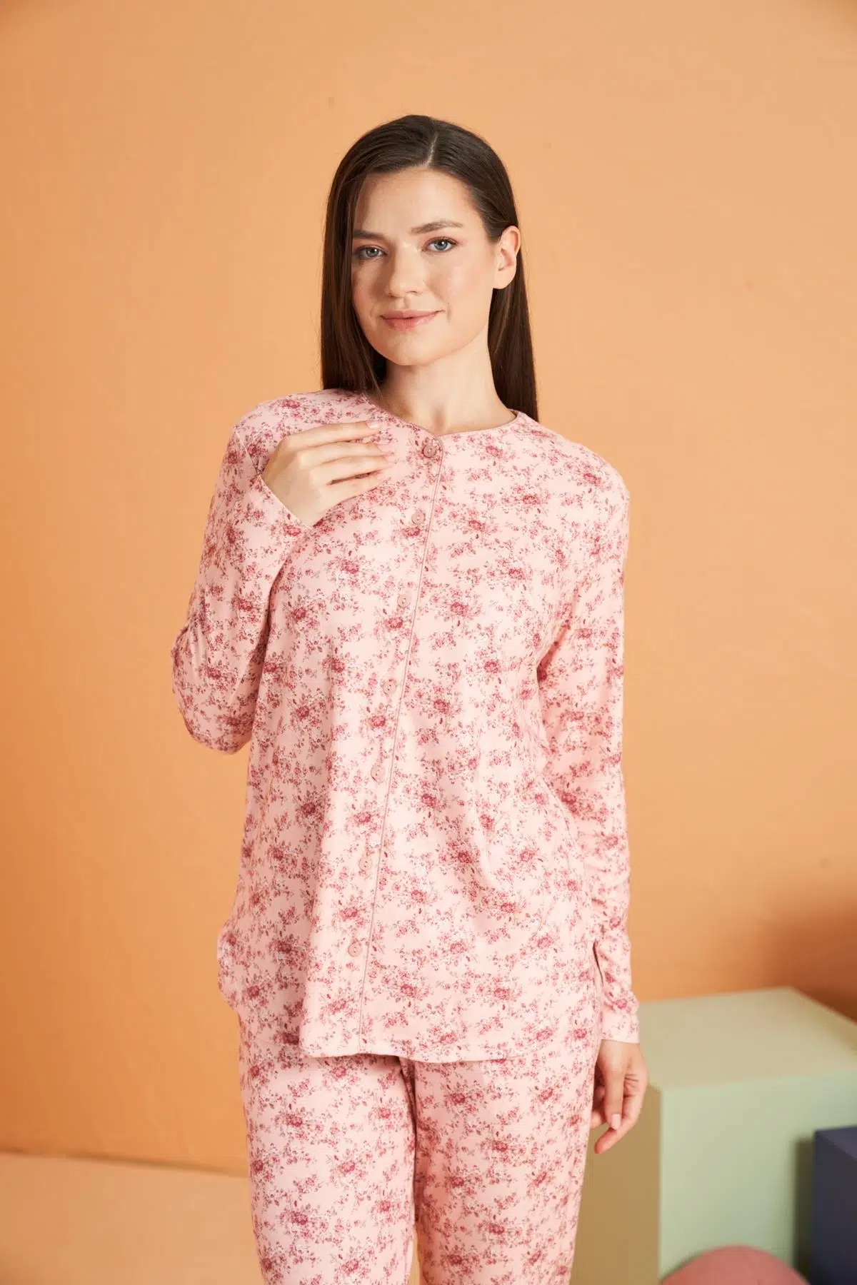 Thermal örme yapıda, düğmeli ön kapama ve yuvarlak yaka ile düzenli duruş sağlar. Üst çiçek desenli, alt düz ve yan cepli tasarım serin günlerde dengeli konfor sunar.