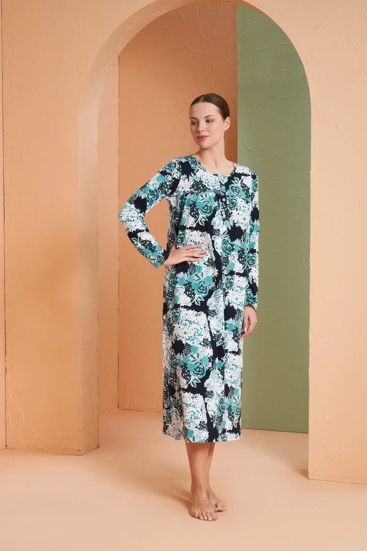PJS Kadın Desenli %100 Pamuk Uzun Kol Gecelik