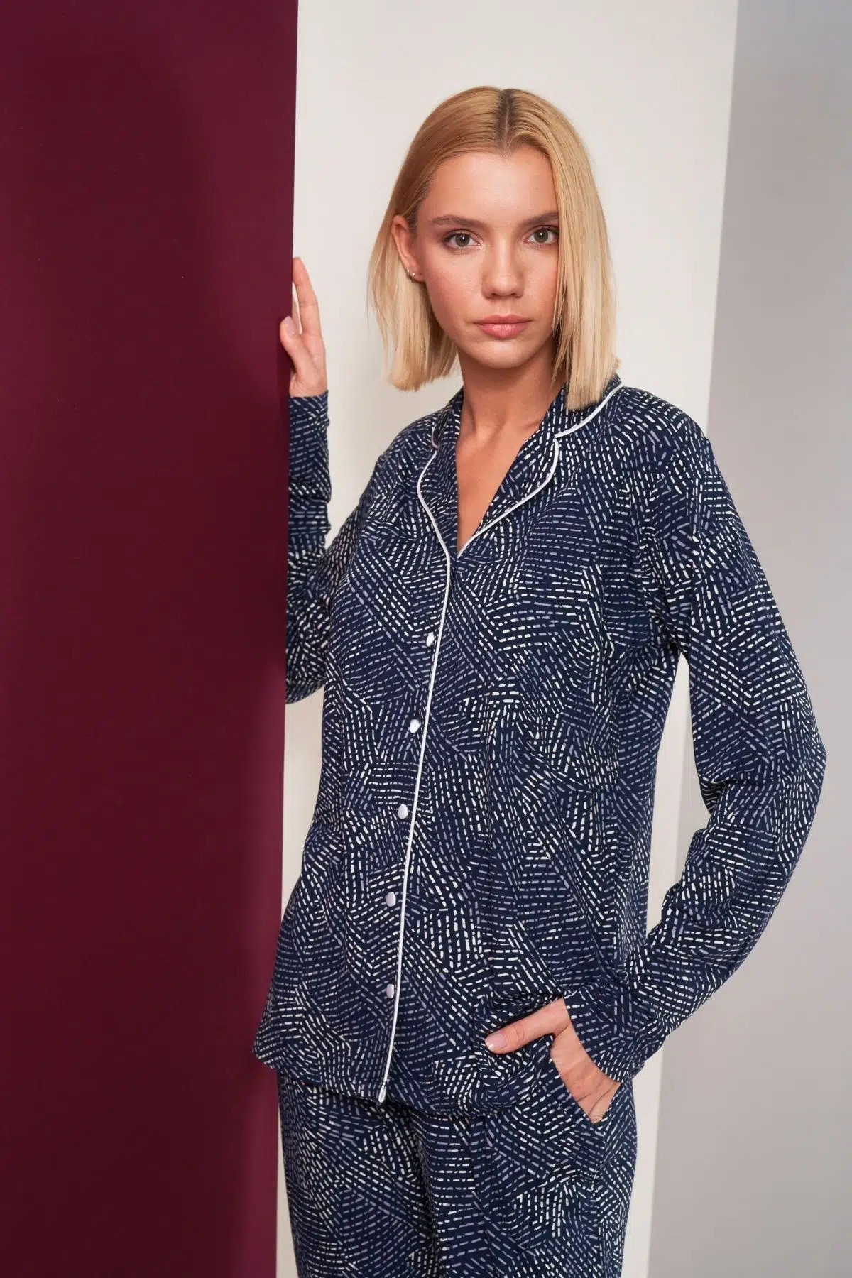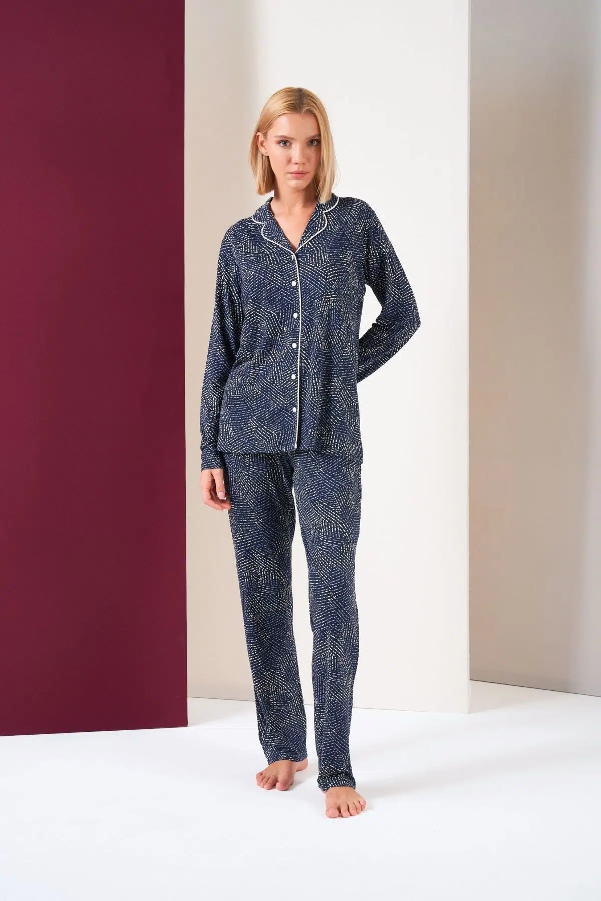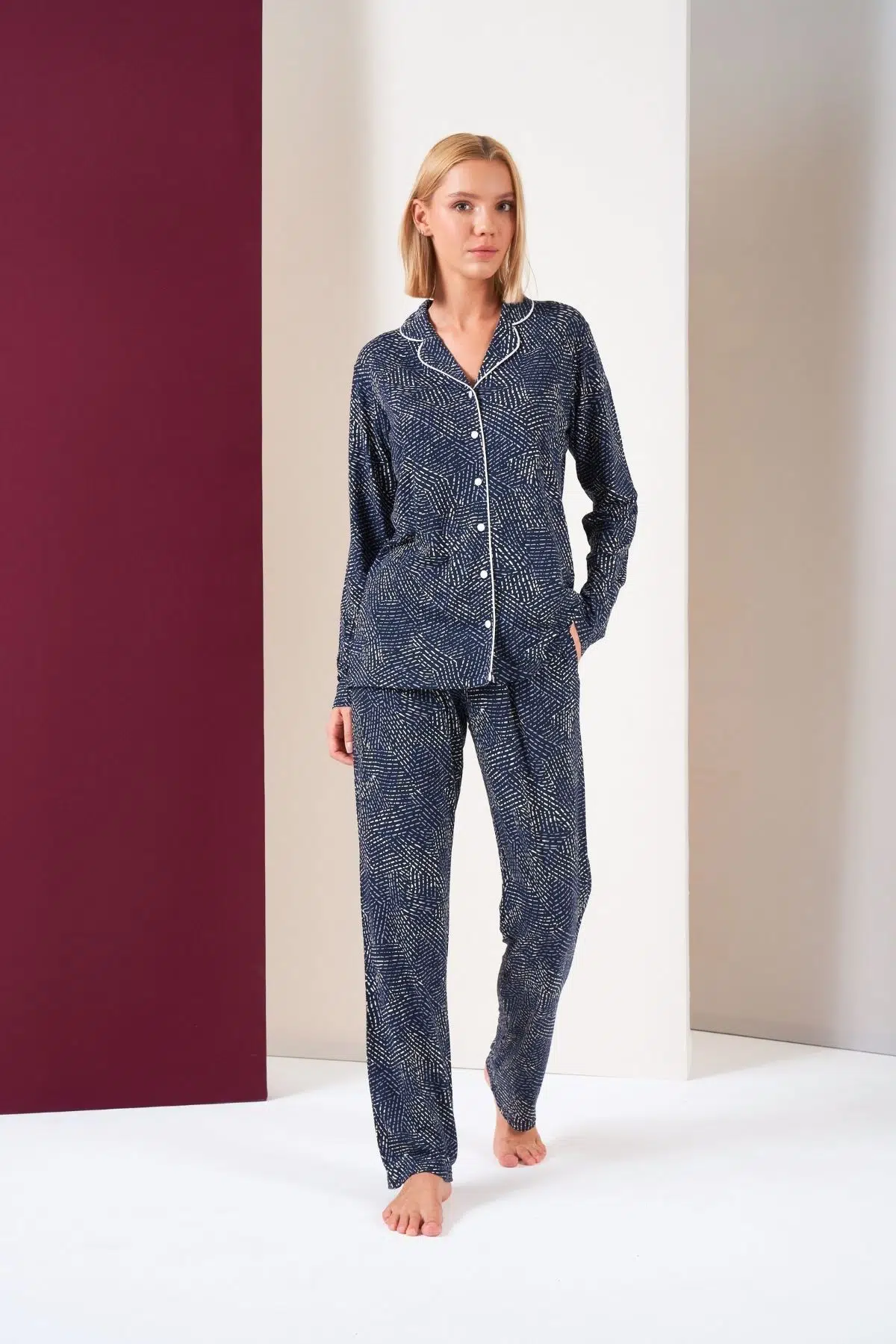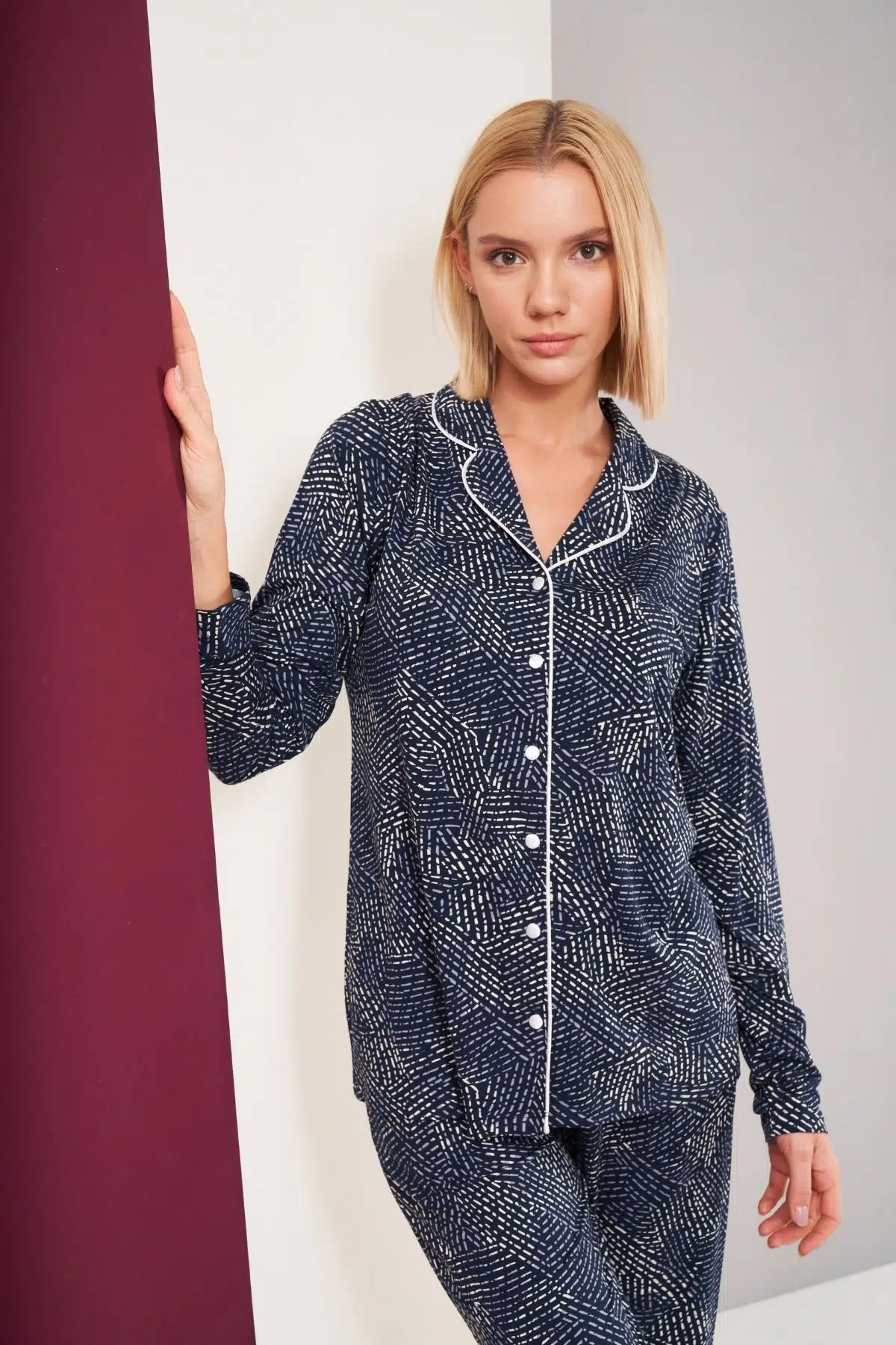 | Etiketler | Pjs Kadın Düğmeli Biyeli Desenli Alt Cepli Uzun Kol Pijama Takım |