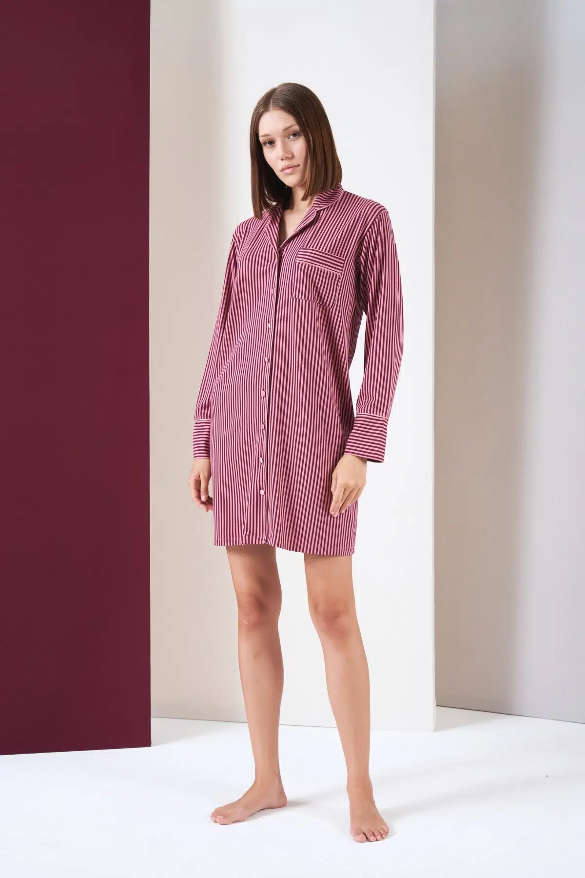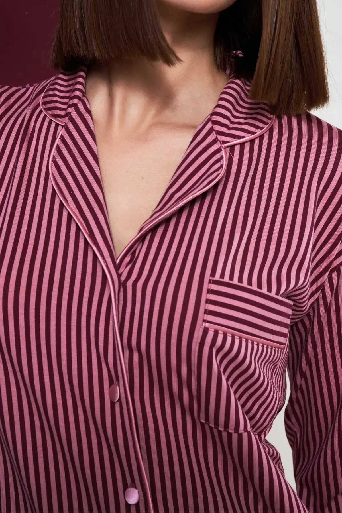EtiketlerPjs Kadın Düğmeli Gülkurusu-Bordo Çizgili Uzun Kol Gecelik