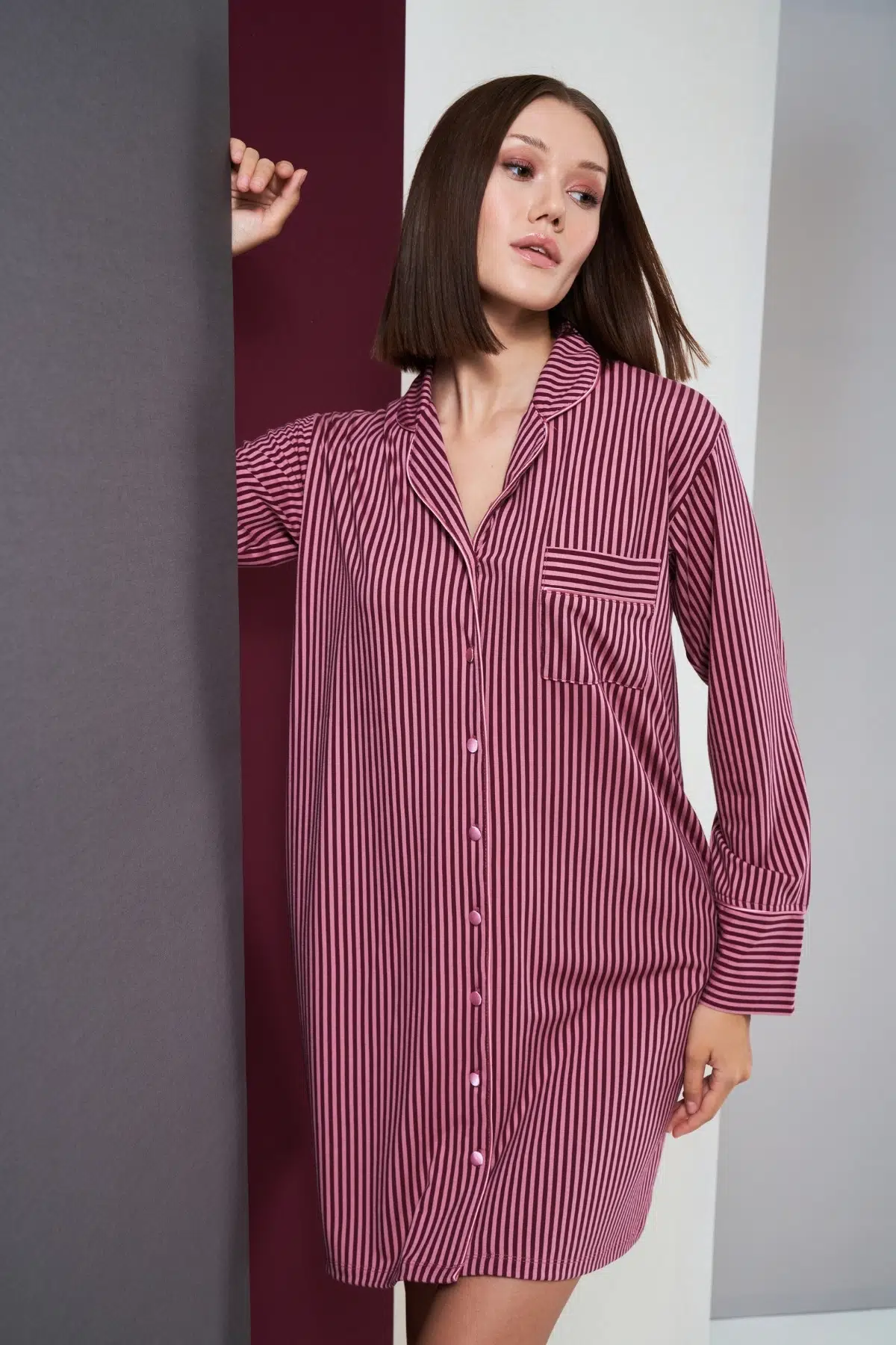 Pjs Kadın Düğmeli Gülkurusu-Bordo Çizgili Uzun Kol Gecelik
