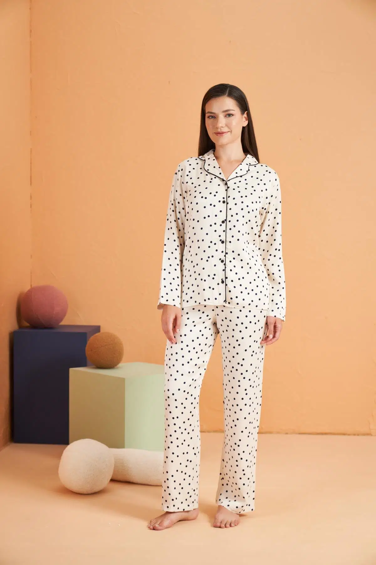Uykunuzda bile şıklığınızdan ödün vermeyin! %100 Polyester Saten kumaşın akıcı dokusu, klasik düğmeli kesim ve zarif biyelerle birleşti. Sevimli puantiye deseniyle bu takım, size hem lüks bir his hem de kesintisiz bir gece konforu vadediyor.